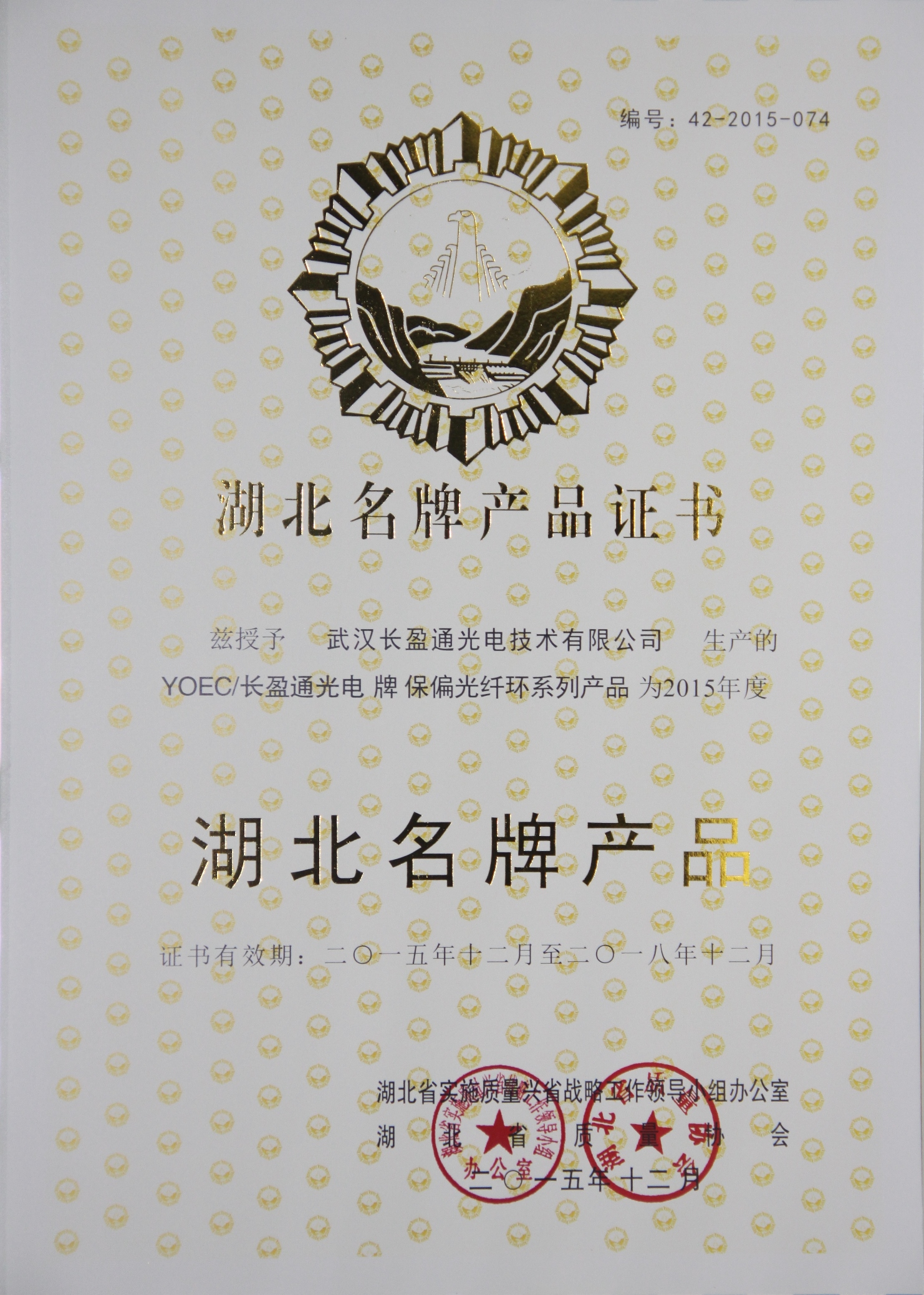百乐博平台通光电技术有限公司喜获”湖北省名牌产品“荣誉证书